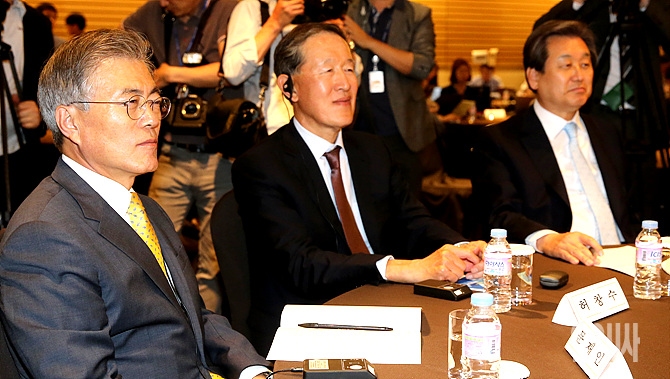 21일, 서울 여의도 전경련회관에서 열린 게르하르트 슈뢰더 전 독일총리 특별대담에 참석한 문재인 새정치민주연합 대표가 심각한 표정을 짓고 있다.