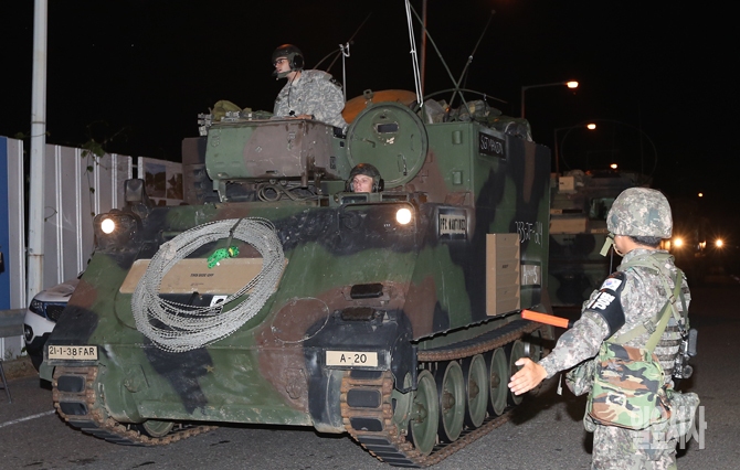 북한의 최후통첩 시한을 앞두고 남북간 고위급 회담이 진행중인 22일 경기도 파주시 통일대교에 미군 장갑차가 들어서고 있다.