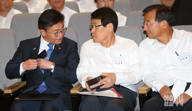 홍용표 통일부 장관(왼쪽부터), 새누리당 이군현 사무총장, 이정현 최고위원이 25일 충남 천안시 우정공무원교육원에서 열린 '2015 새누리당 국회의원 연찬회'에서 대화를 나누고 있다.