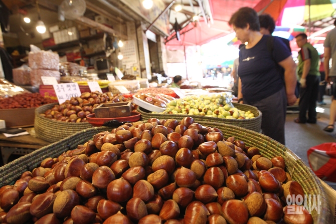 시민들이 15일 오후 서울 동대문구 경동시장에서 추석을 앞두고 햇밤과 대추를 보고 있다.