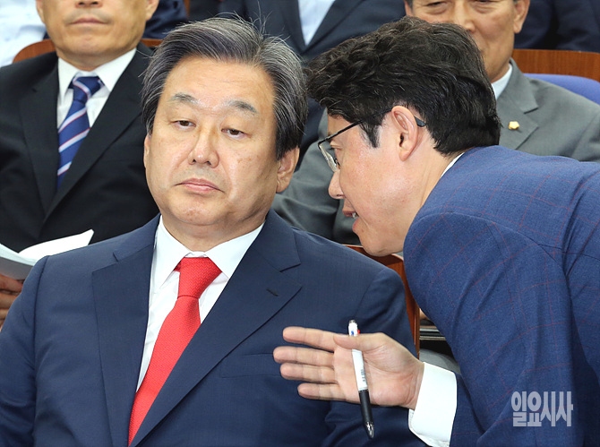 30일, 서울 여의도 국회서 열린 새누리당 의원총회 도중 김무성 대표가 한 당직자로부터 보고 받고 있다.