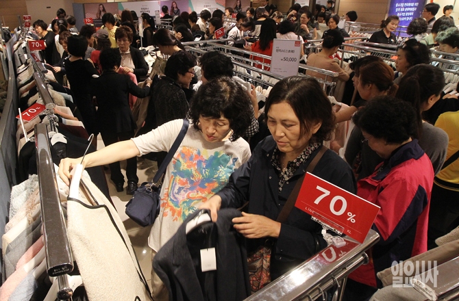 한국판 블랙프라이데이인 코리아 그랜드 세일이 시작 된 1일 오후 서울 중구 소공동 롯데백화점 본점 행사장을 찾은 시민들이 물건을 고르고 있다. 오는 14일까지 열리는 코리아 그랜드 세일은 백화점, 대형마트, 편의점 등 유통업체와 200여개 전통시장, 16개 온라인쇼핑몰 등 2만7000개 점포가 참여하며 업체별로 최대 50∼70% 할인율이 적용된다.