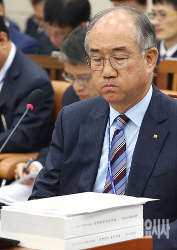 서울 여의도 국회에서 1일, 속개된 기획재정위원회 한국수출입은행, 한국조폐공사에 대한 국정감사에서 이덕훈 한국수출입은행장이 의원들의 질의에 곤혹스러운 표정을 하고 있다.