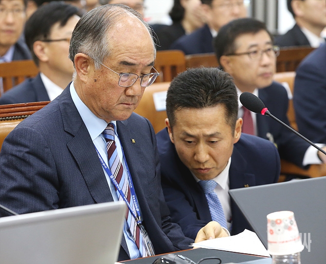 서울 여의도 국회에서 1일, 속개된 기획재정위원회 한국수출입은행, 한국조폐공사에 대한 국정감사 도중 한국수출입은행 관계자가 이덕훈 한국수출입은행장에게 자료를 건네고 있다.