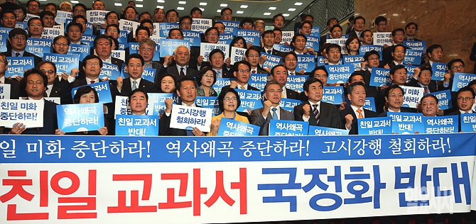 12일, 서울 여의도 국회 정현관 앞에서 새정치민주연합 의원들이 "친일 미화 중단하라! 역사 왜곡을 중단하라"며 친일교과서 국정화 반대 집회를 갖고 있다.