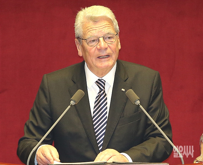 12일, 서울 여의도 국회를 찾은 요하임 가우크 독일연방 대통령이 국회연설을 하고 있다.