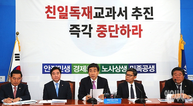 13일, 서울 여의도 국회서 열린 새정치민주연합 원내대책회의서 이종걸 원내대표, 최재천 정책위의장 등이 참석한 가운데 정부의 중·고교 국정교과서 정책과 관련해 이 원내대표가 발언을 하고 있다.