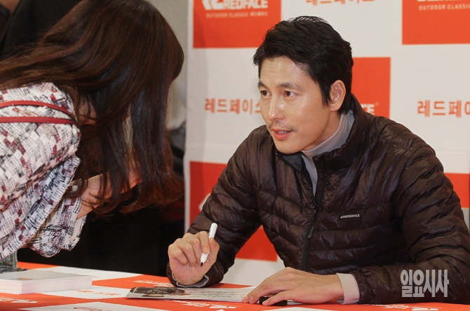 배우 정우성이 15일 오후 서울 마포구 홈플러스 월드컵점에서 열린 아웃도어 브랜드 레드페이스 팬 사인회에서 팬과 대화를 나누고 있다.