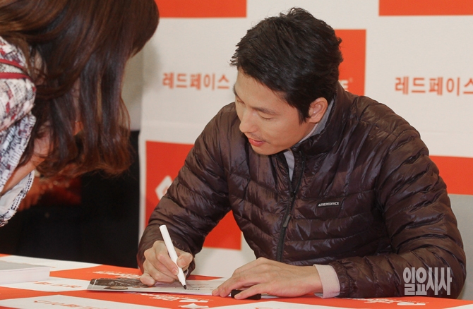 배우 정우성이 15일 오후 서울 마포구 홈플러스 월드컵점에서 열린 아웃도어 브랜드 레드페이스 팬 사인회에서 사인을 하고 있다.