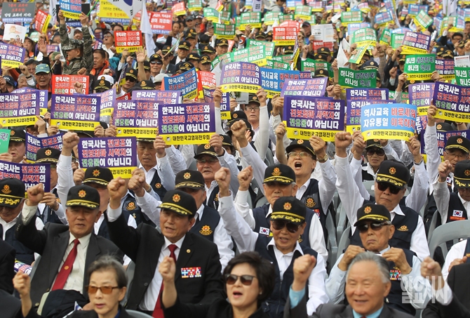 고엽제전우회 회원들이 22일 오후 서울역 광장에서 열린 좌편향 역사교과서 바로잡기 국민대회에서 구호를 외치고 있다.