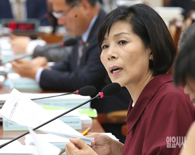 22일, 새정치민주연합 최민희 의원이 서울 여의도 국회서 열린 미래창조과학방송통신위원회 전체회의에서 증인으로 출석한 최양희 미래창조과학부장관에게 질의하고 있다.
