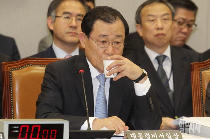 이병기 대통령비서실장이 23일 오전 서울 여의도 국회에서 열린 국회 운영위원회의 대통령비서실 등에 대한 국정감사에서 물을 마시고 있다.