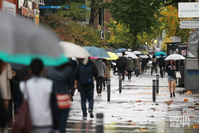 가을비가 내리고 있는 가운데 27일 오전 서울 동작구 방배동에서 우산을 쓰고 출근길에 나선 시민들이 발걸음을 재촉하고 있다.