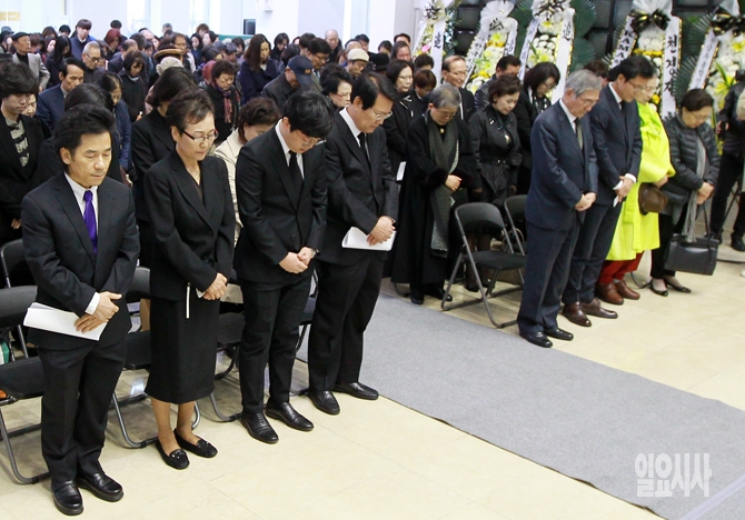 고 천경자 화백의 유가족들과 추도식에 참석한 시민들이 30일 오전 서울 중구 서울시립미술관에서 열린 고 천경자 화백의 추도식에서 묵념을 하고 있다.