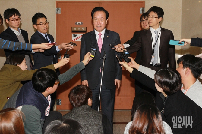 이병석 정치개혁특별위원회 위원장이 9일 오후 서울 여의도 국회 정론관 기자회견장에서 가진 국회의원 선거구 획정기준 중재안 발표 기자회견 후 기자들의 질문에 답변하고 있다.