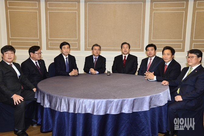 선거구획정 법정시한을 하루 남겨둔 12일 오후 서울 여의도 국회에서 김무성 새누리당 대표와 문재인 새정치민주연합 대표를 비롯한 여야 지도부가 4+4 회담을 갖고 있다.