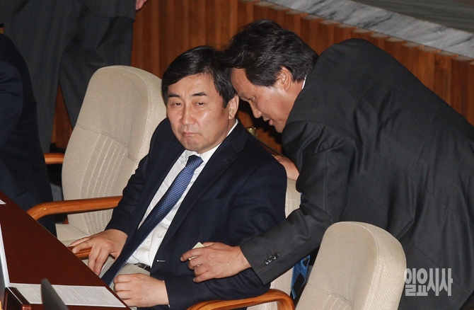 이종걸 새정치민주연합 원내대표가 12일 오후 서울 여의도 국회에서 열린 국회 본회의에서 예결위 야당 간사인 안민석 의원과 대화를 나누고 있다.