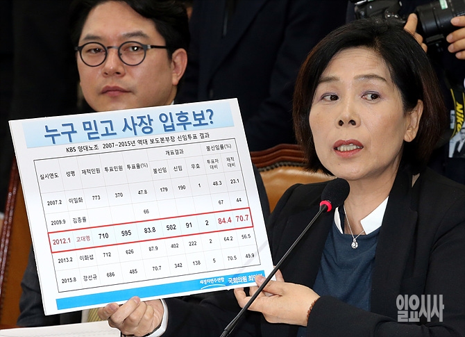 16일, 서울 여의도 국회서 열린 고대영 KBS 사장 후보자에 대한 인사청문회서 새정치민주연합 최민희 의원이 이 후보자에게 질의를 하고 있다.