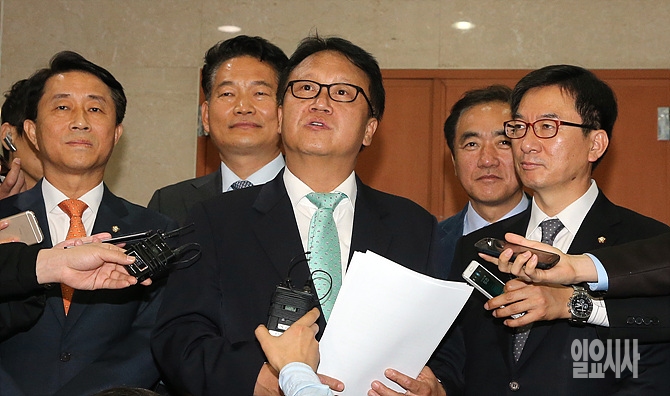 16일, 서울 여의도 국회 정론관 앞에서 새정치민주연합 민병두 의원이 통합행동 기자회견 직후 취재진의 질문에 답변하고 있다.