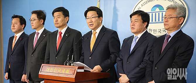 8일, 서울 여의도 국회 정론관에서 권성동 의원(사진 오른쪽서 세 번째, 환노위) 등 여당 상임위 간사들이 기자회견을 갖고 있다. 이들은 이날 기자회견을 통해 본회의 처리를 기다리고 있는 노동개혁법 등의 조속한 처리를 촉구했다.