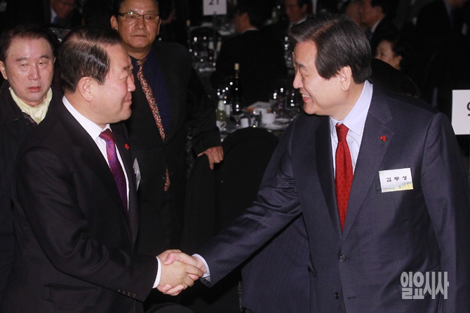 김무성 새누리당 대표와 무소속 박주선 의원이 10일 오후 서울 영등포구 여의도 63빌딩에서 김대중평화센터(이사장 이희호)의 주최로 열린 고 김대중 대통령 노벨평화상 수상 15주년 기념식에서 인사를 나누고 있다.