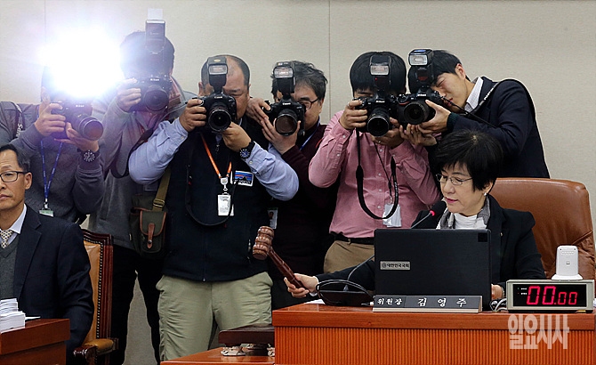 15일, 서울 여의도 국회 환경노동위원회 회의실에서 열린 전체회의 직전, 김영주 환노위위원장이 개의를 알리는 의사봉을 두드리고 있다.
