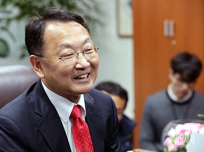 21일, 신임 경제부총리로 내정된 유일호 새누리당 의원이 자신의 의원회관 사무실에서 내정과 관련된 취재진의 질문에 밝은 표정으로 답변하고 있다.