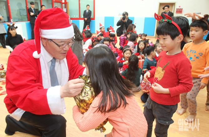 크리스마스 이브인 24일 오전 정의화 국회의장이 국회 어린이집을 찾아 어린이들에게 선물을 나눠주고 있다.