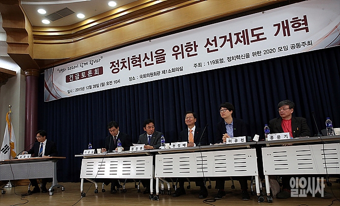 28일, 서울 여의도 국회서 '정치혁신을 위한 선거제도 토론회'에 앞서 천정배·안철수 무소속 의원과 이종걸 새정치민주연합 의원, 정진후 정의당 의원 등이 참석해 토론회가 열리고 있다.