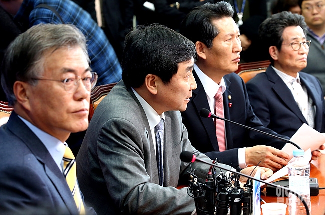 6일, 서울 여의도 국회서 북한 수소폭탄 실험 관련 더불어민주당 긴급 대책회의 도중 이종걸 원내대표가 발언을 하고 있다.