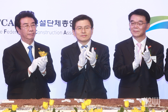 최삼규 대한건설단체총연합회장, 황교안 국무총리, 강호인 국토교통부장관(왼쪽부터)이 7일 오후 서울 소공동 롯데호텔에서 열린 '2016 건설인 신년인사회'에서 박수를 치고 있다.