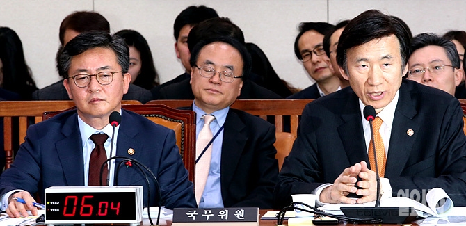 7일, 서울 여의도 국회서 열린 북한 수소폭탄 실험 발표 현안보고에 출석한 윤병세 외교부장관(사진 오른쪽)이 의원들의 질의에 답변하고 있다.