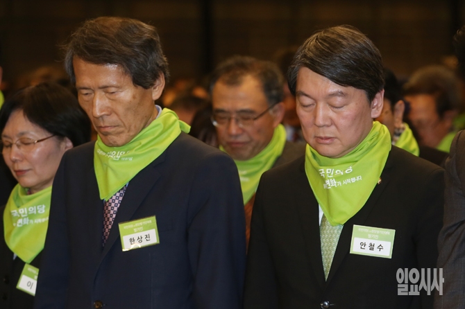 국민의당 창당을 추진하고 있는 한상진 서울대 명예교수와 무소속 안철수 의원(오른쪽)이 10일 오후 서울 종로구 세종문화회관 세종홀에서 열린 국민의당 창당발기인대회에서 묵념을 하고 있다.