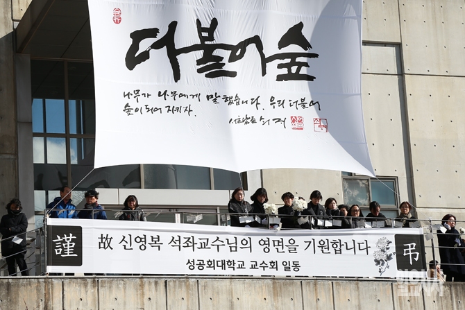 추모객들이 18일 오후 서울 구로구 성공회대학교에서 열린 고 신영복 성공회대 석좌교수의 영결식 후 고인의 영정과 유해를 실은 운구차량이 떠나는 모습을 지켜보고 있다.