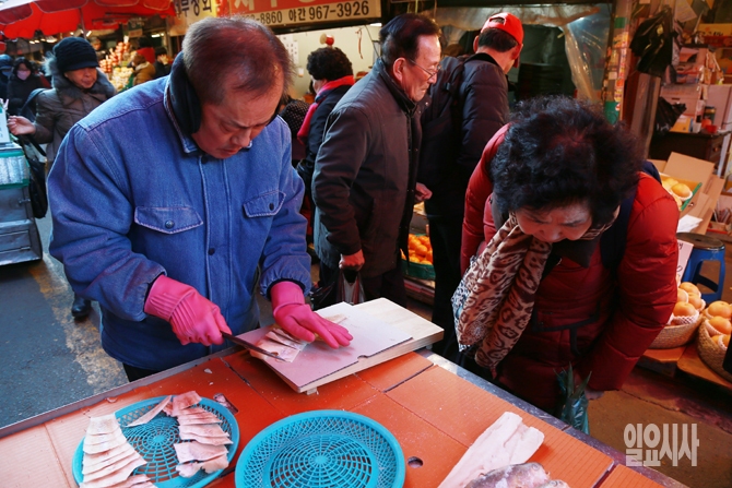 구정 설 명절이 일주일 앞으로 다가온 가운데 1일 오후 서울 동대문구 경동시장에서 한 상인이 동태포를 뜨고 있다.