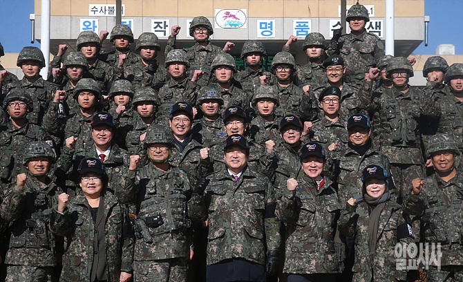 1일, 새누리당 김무성 대표 등 새누리당 의원들이 강원도 철원군 소재의 육군 제 6사단을 방문한 자리에서 군 장병들과 함께 파이팅을 외치고 있다. (사진공동취재단)