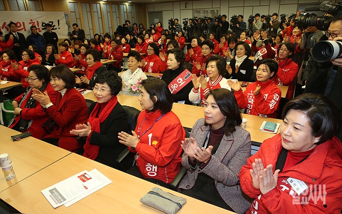 3일, 서울 여의도 국회 의원회관서 열린 새누리당 20대총선 여성후보자대회에 이자스민 의원(사진 오른쪽서 두 번째), 김행 예비후보 등이 참석해 박수를 치고 있다.