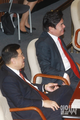 새누리당 원유철 원내대표와 김정훈 정책위의장이 4일 오후 서울 여의도 국회에서 열린 국회 본회의에서 기업활력제고특별법(원샷법)이 통과되자 환하게 웃고 있다.