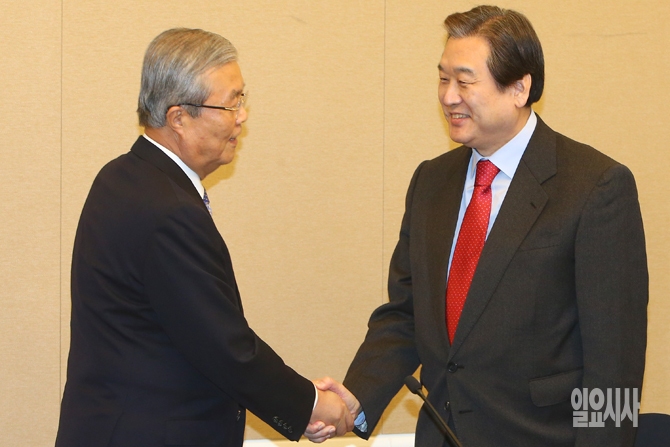 김종인 더불어민주당 비대위원장과 김무성 새누리당 대표가 4일 오후 서울 여의도 국회에서 본회의 직후 가진 여야 대표-원내대표 회동에서 악수를 나누고 있다.