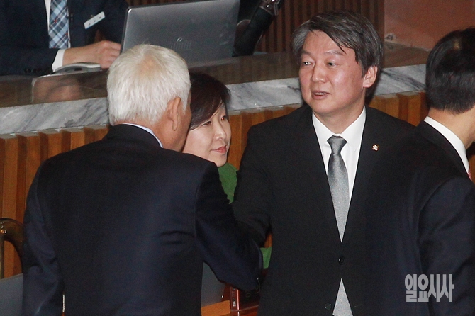 국민의당 안철수 공동대표와 김한길 의원이 18일 오전 서울 여의도 국회에서 열린 국회 본회의에서 악수를 하고 있다.