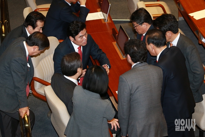 새누리당 김무성 대표와 원유철 원내대표 등 새누리당 소속 의원들이 23일 오후 서울 여의도 국회에서 열린 국회 본회의에서 테러방지법 관련 무제한토론이 시작되자 논의를 하고 있다.