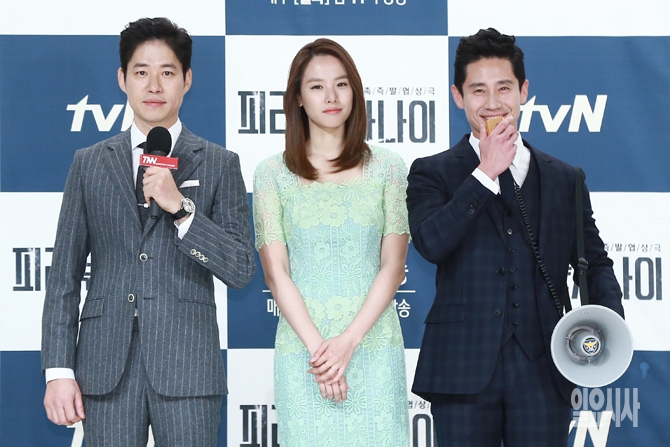 배우 유준상, 조윤희, 신하균이 25일 오후 서울 영등포 타임스퀘어 아모리스에서 열린 tvN 드라마 <피리부는 사나이> 제작발표회에서 포토타임을 갖고 있다.