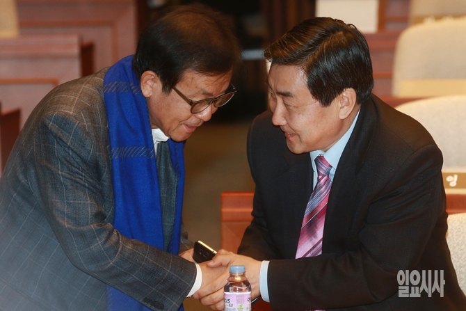 더불어민주당 이종걸 원내대표와 원혜영 의원이 29일 오전 서울 여의도 국회에서 열린 더불어민주당 의원총회에서 악수를 나누고 있다.
