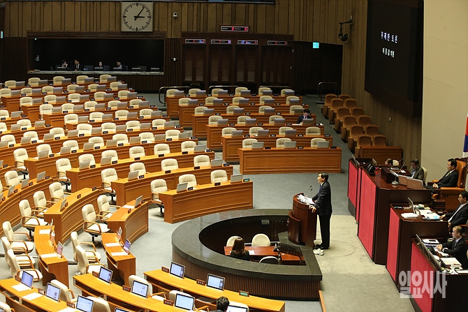 2일, 서울 여의도 국회 본회의장에서 더불어민주당 이종걸 의원(원내대표)가 마지막 필리버스터(무제한 토론) 주자로 나서 '나홀로 발언'을 하고 있다.