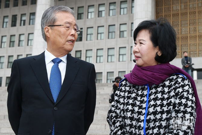 3일 오전 서울 여의도 국회에서 열린 더불어민주당 '달리는 정책의자' 발대식에서 더불어민주당 김종인 비대위대표와 손혜원 홍보위원장이 대화를 하고 있다.