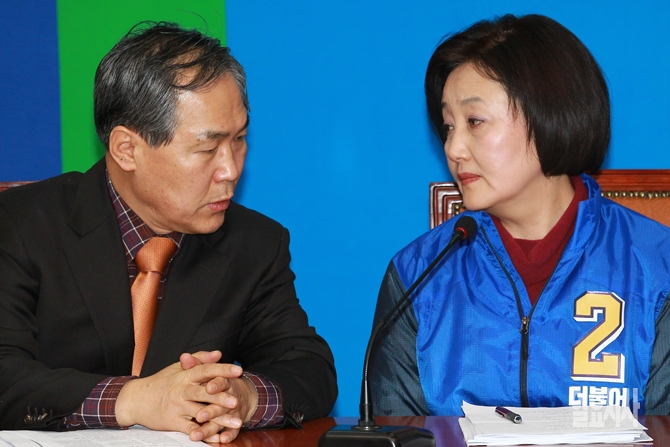더불어민주당 박영선 비대위원과 우윤근 비대위원이 11일 오전 서울 여의도 국회에서 열린 더불어민주당 선대위-비대위 연석회의에서 대화를 하고 있다.
