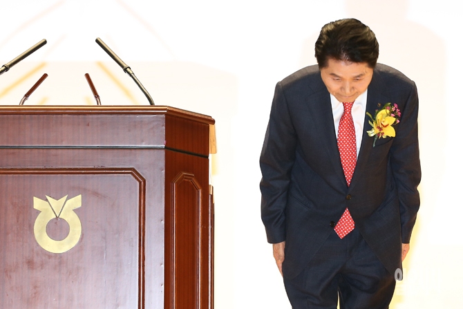 김병원 농협중앙회 회장이 14일 오전 서울 중구 농협중앙회 본관에서 열린 김병원 농협중앙회 제23대 회장 취임식에서 인사를 하고 있다.