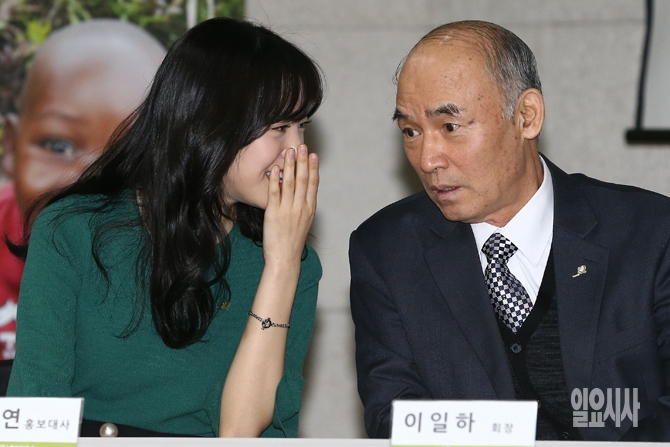 배우 진세연이 17일 오전 서울 영등포구 굿네이버스 본부에서 열린 굿네이버스 진세연 홍보대사 위촉식에서 이일하 굿네이버스 회장과 대화를 하고 있다.