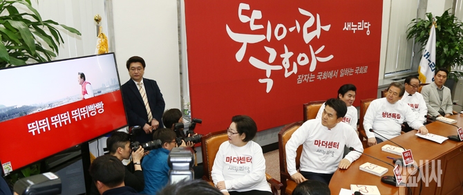 김무성 새누리당 대표를 비롯한 당 지도부가 21일 오전 서울 여의도 국회에서 열린 새누리당 최고위원회의에서 제20대 총선 주제곡을 보고 있다.