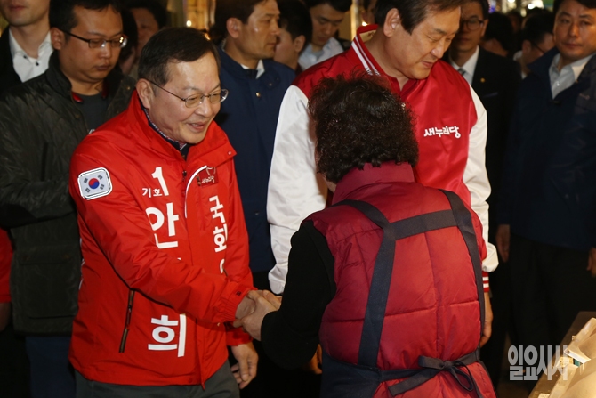 4.13 총선 공식선거운동 시작일인 31일 오전 서울 마포구 아현시장에서 새누리당 안대희 후보가 시장상인과 악수를 하고 있다.